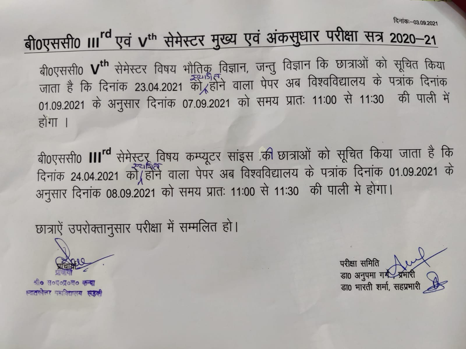 Leftover Exams(B.SC.3rd (Computer Science) & B.SC.5th(Zoology & Phyics) Post author: Post published:September 3, 2021 Post category:Homeonly leftover exams of zoology and physics of BSc 5th sem (23rd April )and computer science of 3 rd sem(24.April) will be held on 7th and 8th September 20 21 You Might Also Like Inaugration of Art Exhibition – “Azadi ke Mahanayak” January 25, 2022 Oneday workshop on Block Printing Methods June 5, 2022 Awareness Program has been conducted on Cyber Crime April 2, 2024