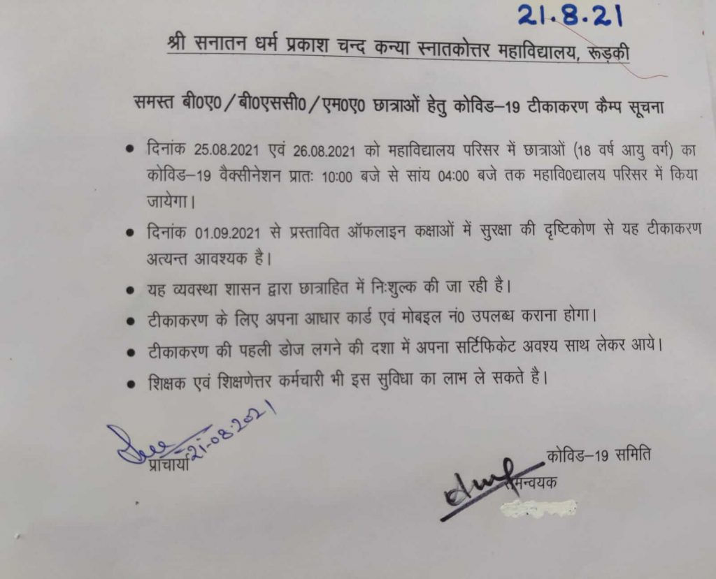 Notice regarding Covid 19 vaccination on 25th & 26 th Aug 2021 in College campus Post author: Post published:August 21, 2021 Post category:Homeonly Notice regarding Covid 19 vaccination on 25th & 26 th Aug 2021 in College campus You Might Also Like Orientation Program by Career Guidance cell November 12, 2021 7-Day N.S.S. Special Camp begins at village Kanhapur Roorkee March 14, 2023 Independence Day Celebrations August 16, 2024